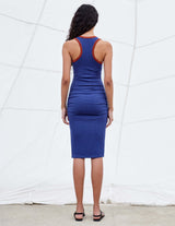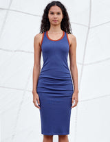 A tank dress in a form fitting, lux rib fabrication. Featuring a colorblock trim.
