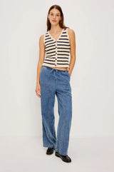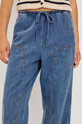 The Sanderson is a mid-rise, relaxed fit denim pant crafted from lightweight, supple cotton. Featuring carpenter panels for a laid-back look and an adjustable corded drawstring for a customized fit.