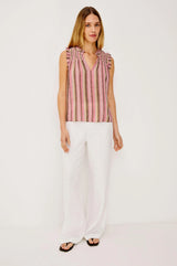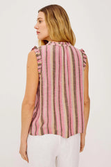The Arlene Top is crafted from luxe, lightweight linen, with a loose fit, ruffled split band V-neck, sleeveless design, smocked shoulders, and all-over diamond eyelet embroidery.