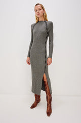 The Imara is a midi-length sweater dress in a ribbed wool blend. Its funnel neckline and fitted silhouette provide a sleek look, with tubular blanket stitching and a subtle slit.