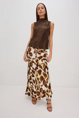 The Kaleen Top is a contemporary tank crafted from smooth, satin-back crepe. It features a draped mock neck and fluid silhouette with a traditional camisole fit.