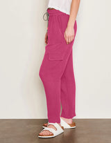These cranberry cargo-style trousers bring a relaxed coastal vibe with their lightweight cotton gauze fabric and easy pull-on fit. Featuring a striped drawstring waist, subtle utility pockets, and a gently tapered leg, they’re the perfect blend of casual comfort and everyday style.