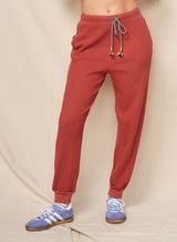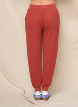 These joggers in burnt brick feature a cozy waffle knit texture with a relaxed fit and tapered leg. Designed with an elastic waistband and striped rope drawstring, they balance comfort with a playful touch.
