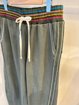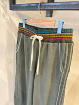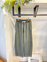 These joggers feature a relaxed wide-leg fit with side pockets and contrast stitching along the seams. A striped elastic waistband with a natural drawstring adds a sporty, retro-inspired touch.