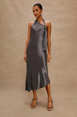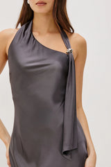 Slip into the Adra Dress, crafted in luxe satin crepe with a body-skimming fit. It features an asymmetric hem, scarf detail, and halter neckline with metal hardware detailing.